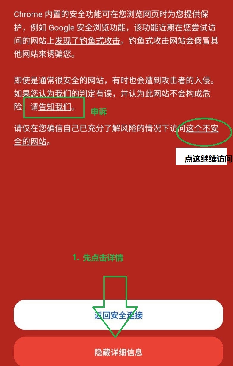 Chrome提示危险网站,请在设置-隐私与安全-安全浏览里关闭保护。或者在红色页面点击详情继续访问,也请帮忙申诉一下网站。